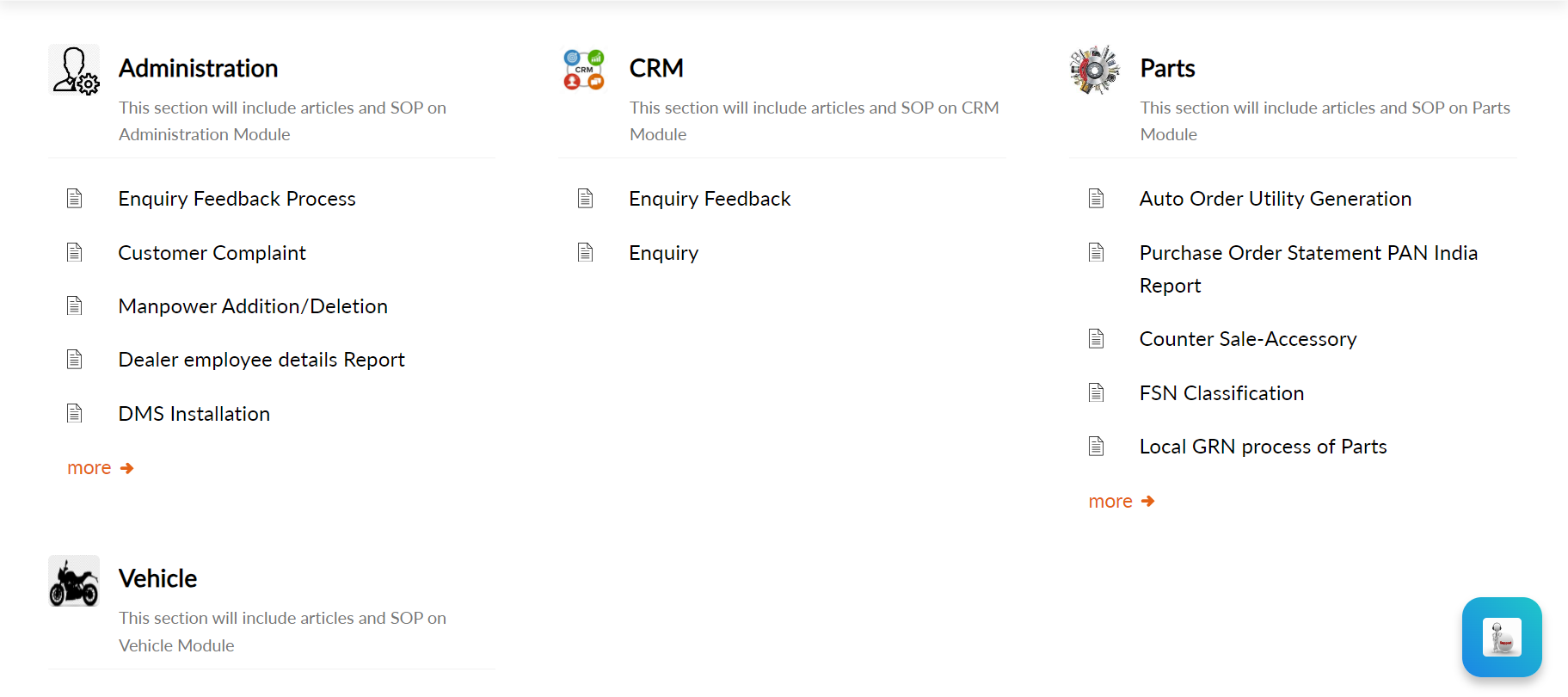 El autoservicio del concesionario está diseñado para ayudar a los distribuidores, distribuidores y usuarios de la oficina central (HO). Esta plataforma proporciona documentación completa que cubre varias funcionalidades, módulos de proceso, artículos y procedimientos operativos estándar (SOP) para garantizar un uso sin errores del DMS.