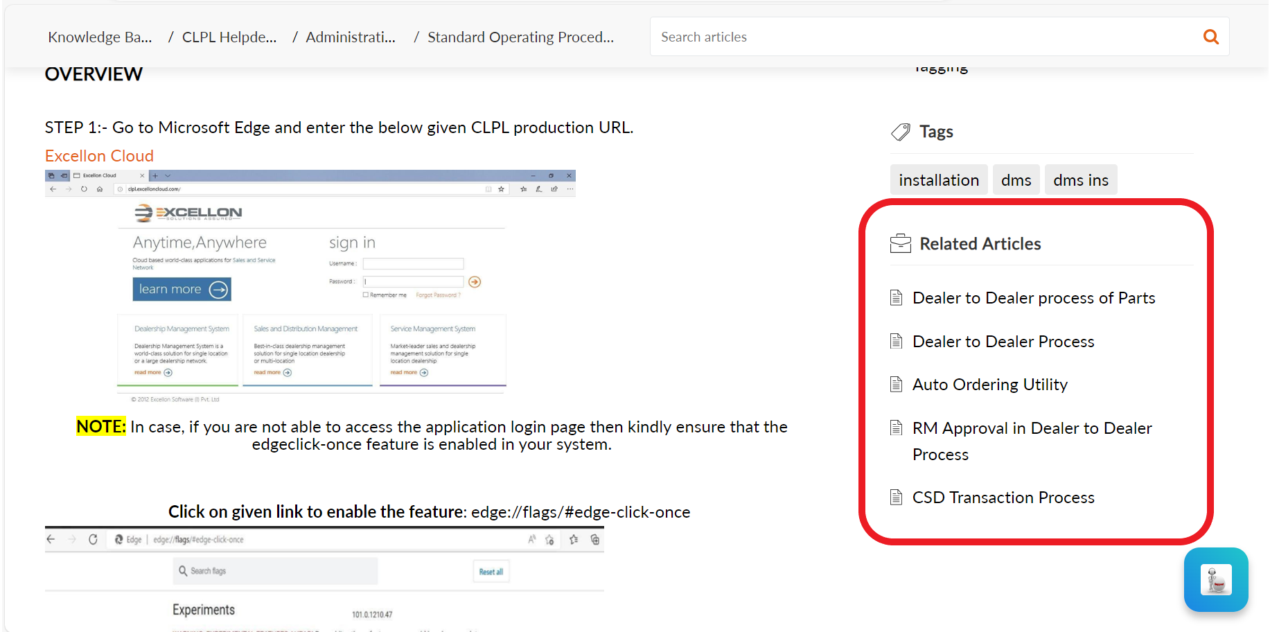 Paso 1: Los usuarios del concesionario pueden acceder a SOP y artículos en varios módulos como Administración, CRM, Piezas y Vehículo
